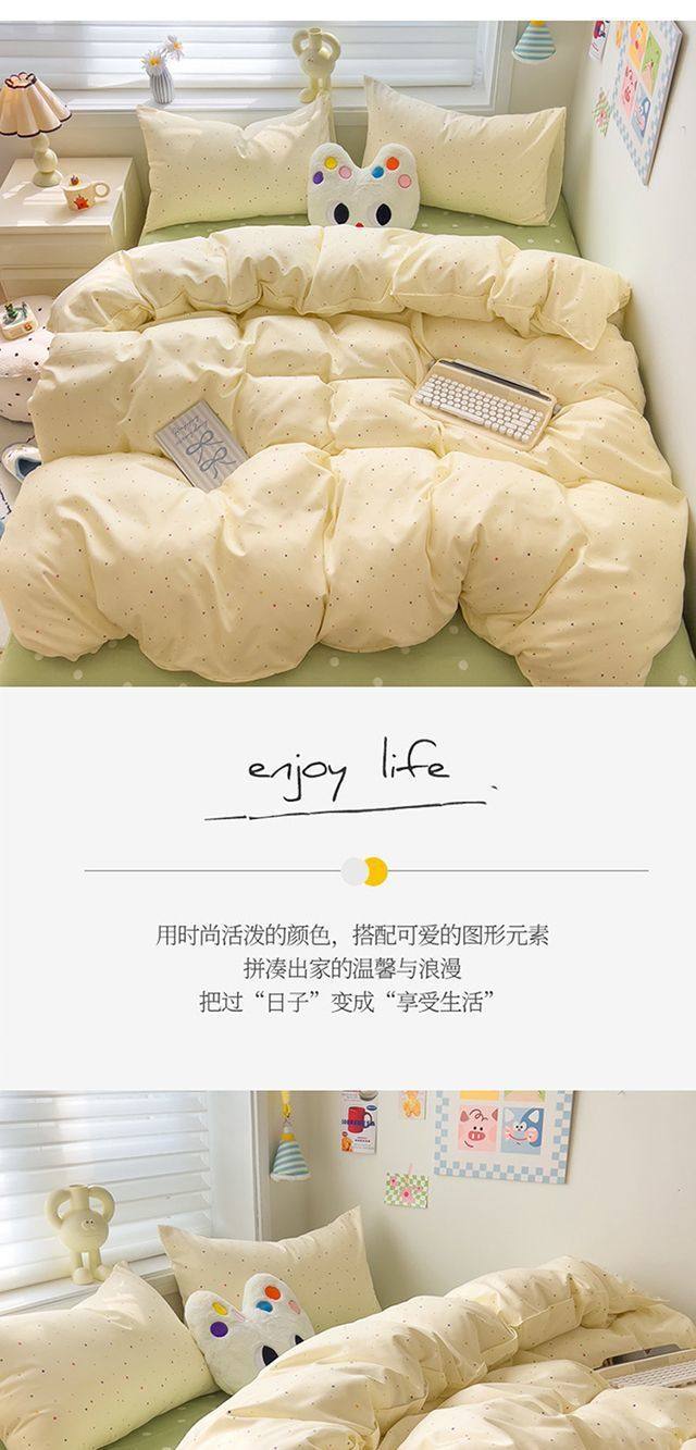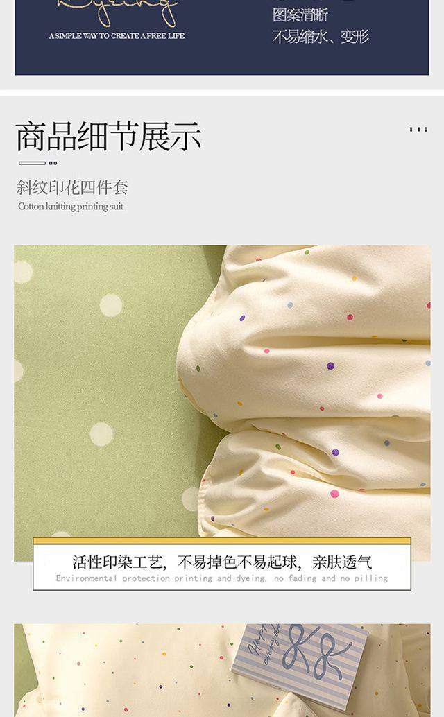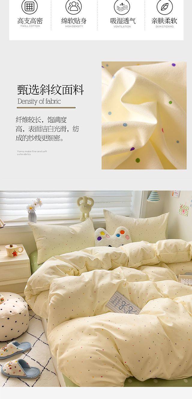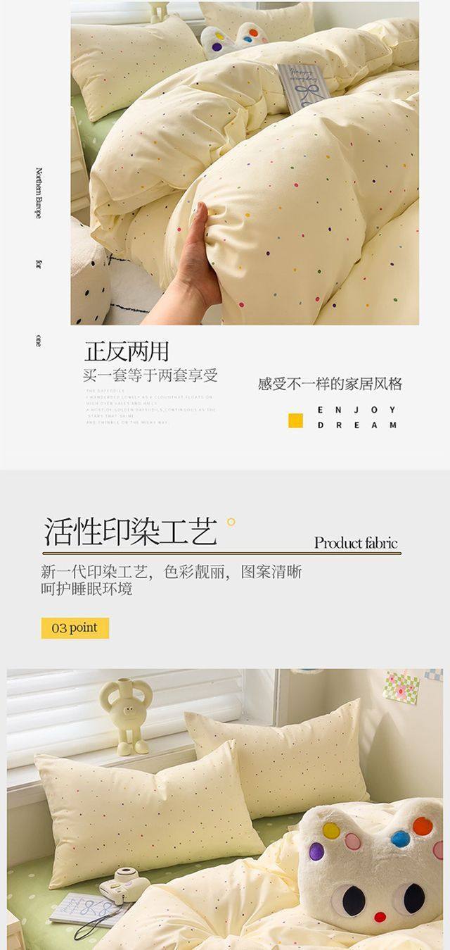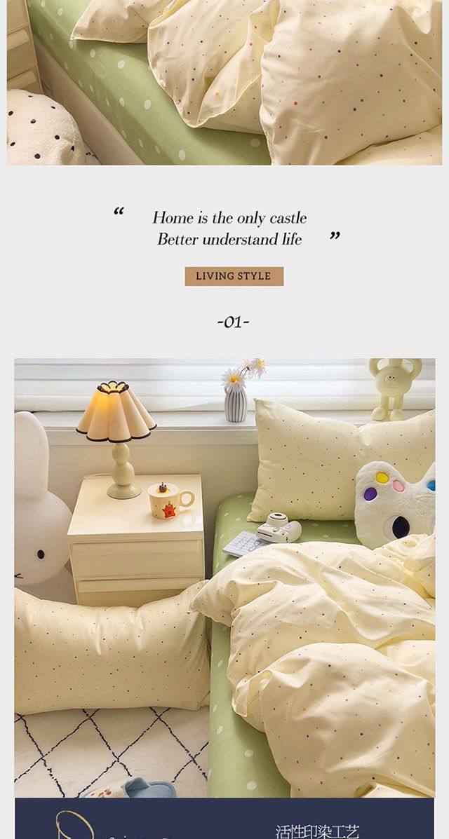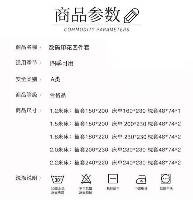 | Size specifications | 1.2m bed sheet three-piece set (quilt cover 150*200),1.5m bed sheet four-piece set (quilt cover 150*200,1.8m bed sheet four-piece set (quilt cover 180*220),2.0m bed sheet four-piece set (quilt cover 200*230) |