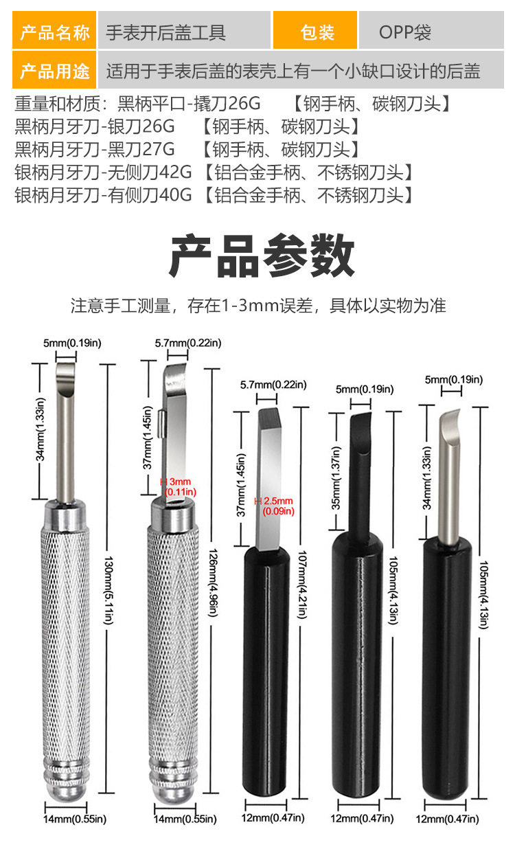 | Specifications | Watch repair tool silver handle crescent knife-with measuring knife,Watch repair tool black handle flat blade - pry tool,Watch repair tool black handle crescent knife-silver knife,Watch repair tool black handle crescent knife-black knife,Watch repair tool silver handle crescent knife-no measuring knife |