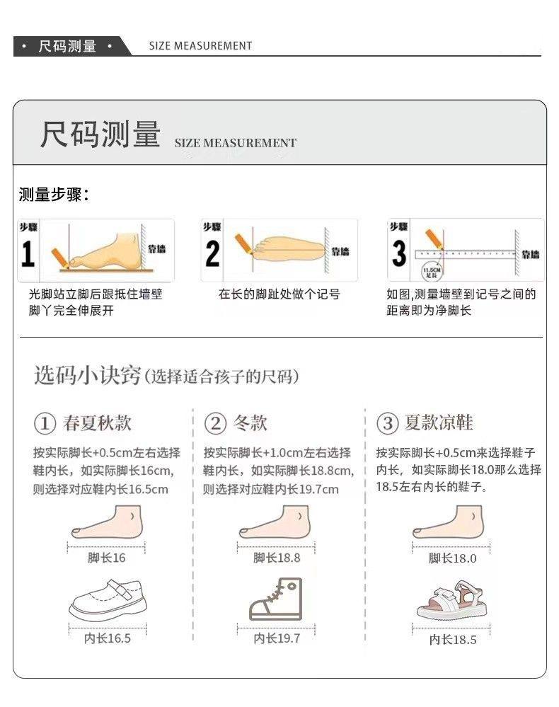 | Size | Size 26 has an insole length of 15.7 cm,Size 27 has an insole length of 16.3 cm,Size 28 has an insole length of 17cm,Size 29 has an insole length of 17.6 cm,Size 30 has an insole length of 18.3 cm,19cm inside size 31,19.3cm inside size 32,Size 33 has an insole length of 20cm,Size 34 has an insole length of 20.6 cm,Size 35 has an insole length of 21.3 cm,22cm inside size 36,Inner length 22.5cm in size 37 |