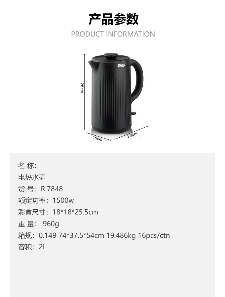 Raf European Standard Cross-Border Portable Electric Water Kettle Household Commercial Food Grade Stainless Steel Anti-Dry Water Kettle