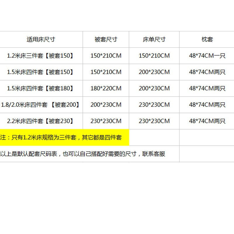 | Size specifications | Duvet cover (1.5m width) + flat sheet (1.5m width) + pillowcase (single),Duvet cover (1.8m width) + flat sheet (2.0m width) + pillowcases (set of 2),Duvet cover 1.8m wide + bed sheet 2.3m wide + pillowcases (set of 2),Duvet cover 2.0m wide + bed sheet 2.3m wide + pillowcases (set of 2),Duvet cover 2.3m wide + flat sheet 2.3m wide + pillowcases (set of 2) |
