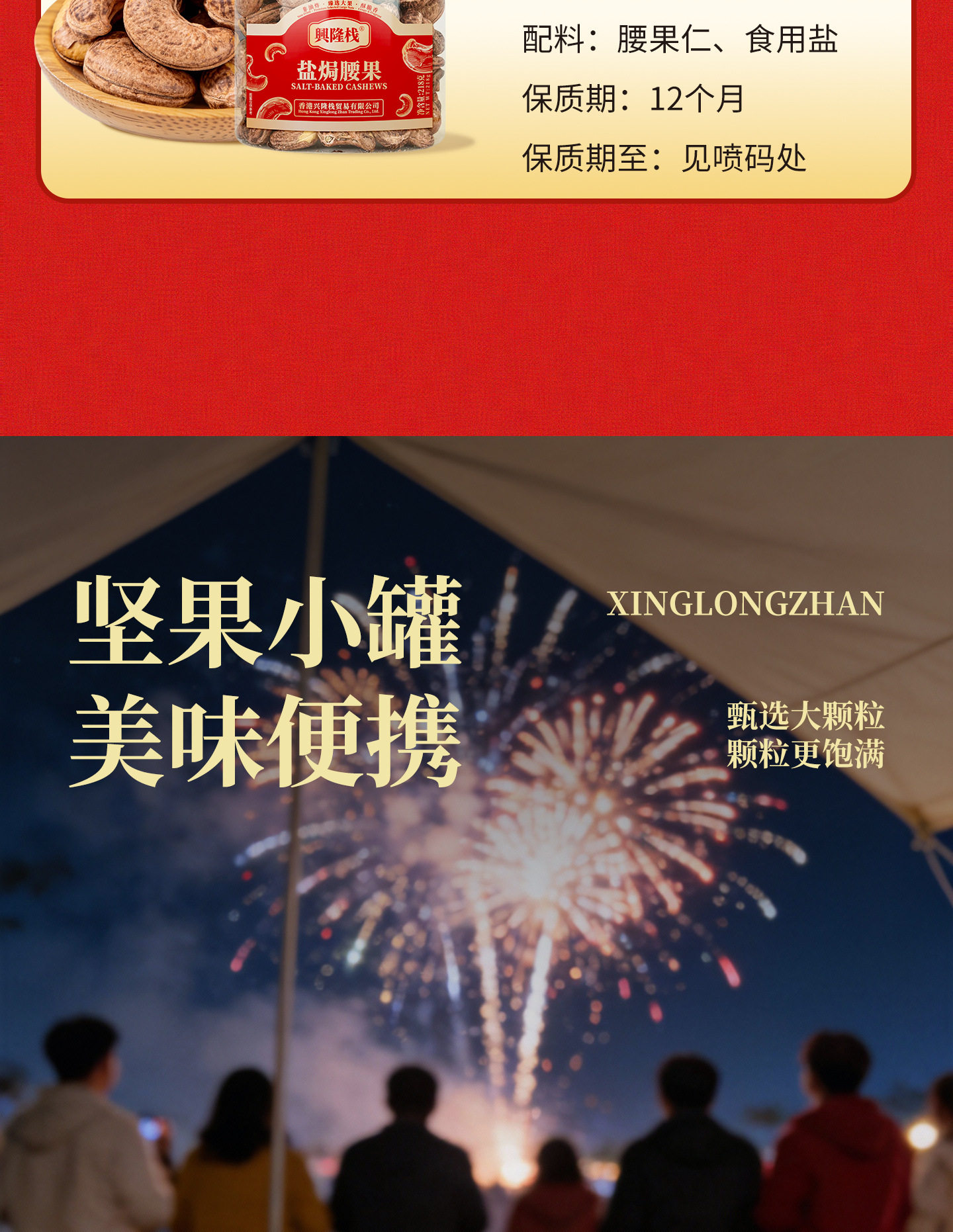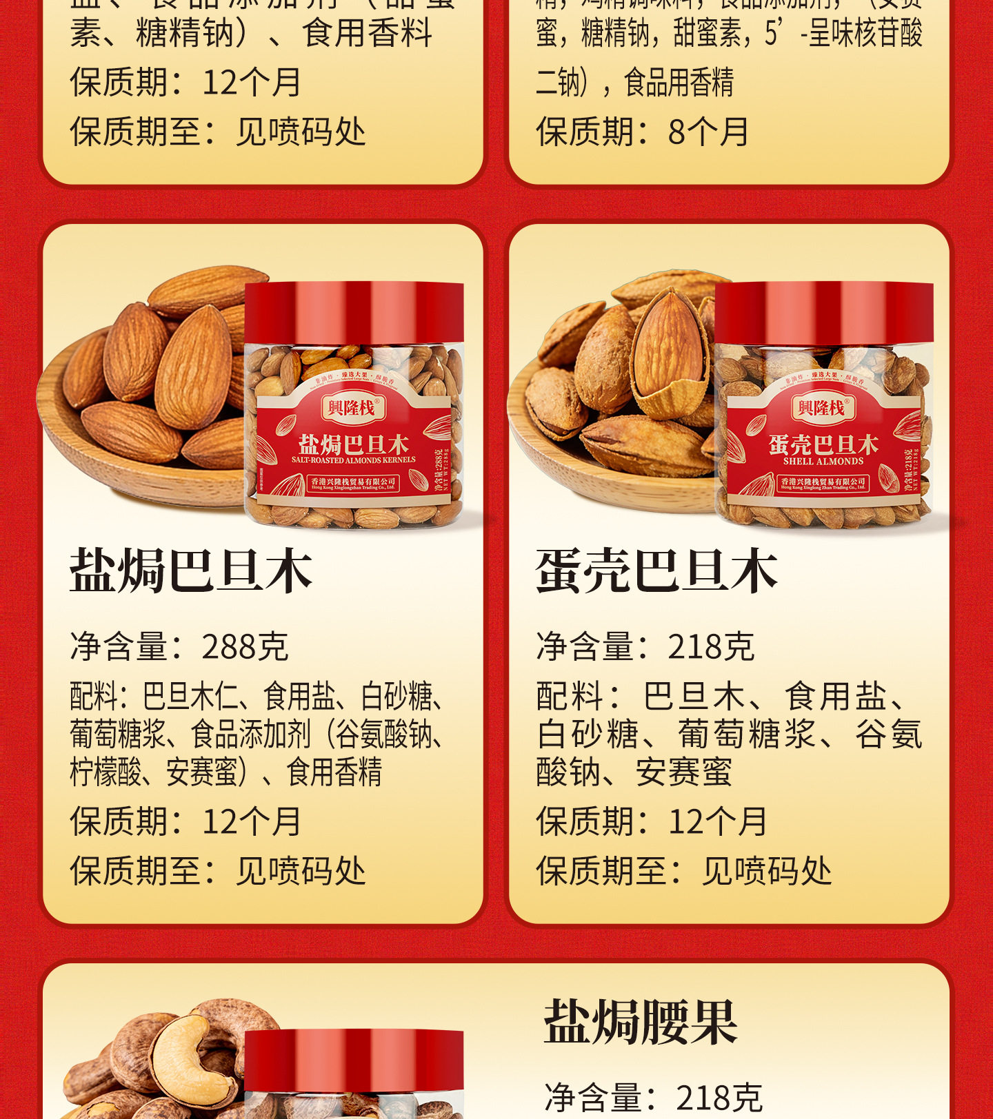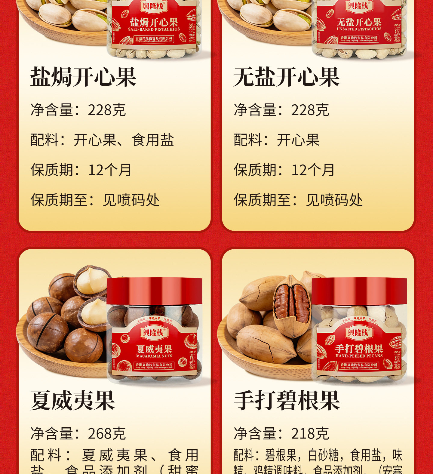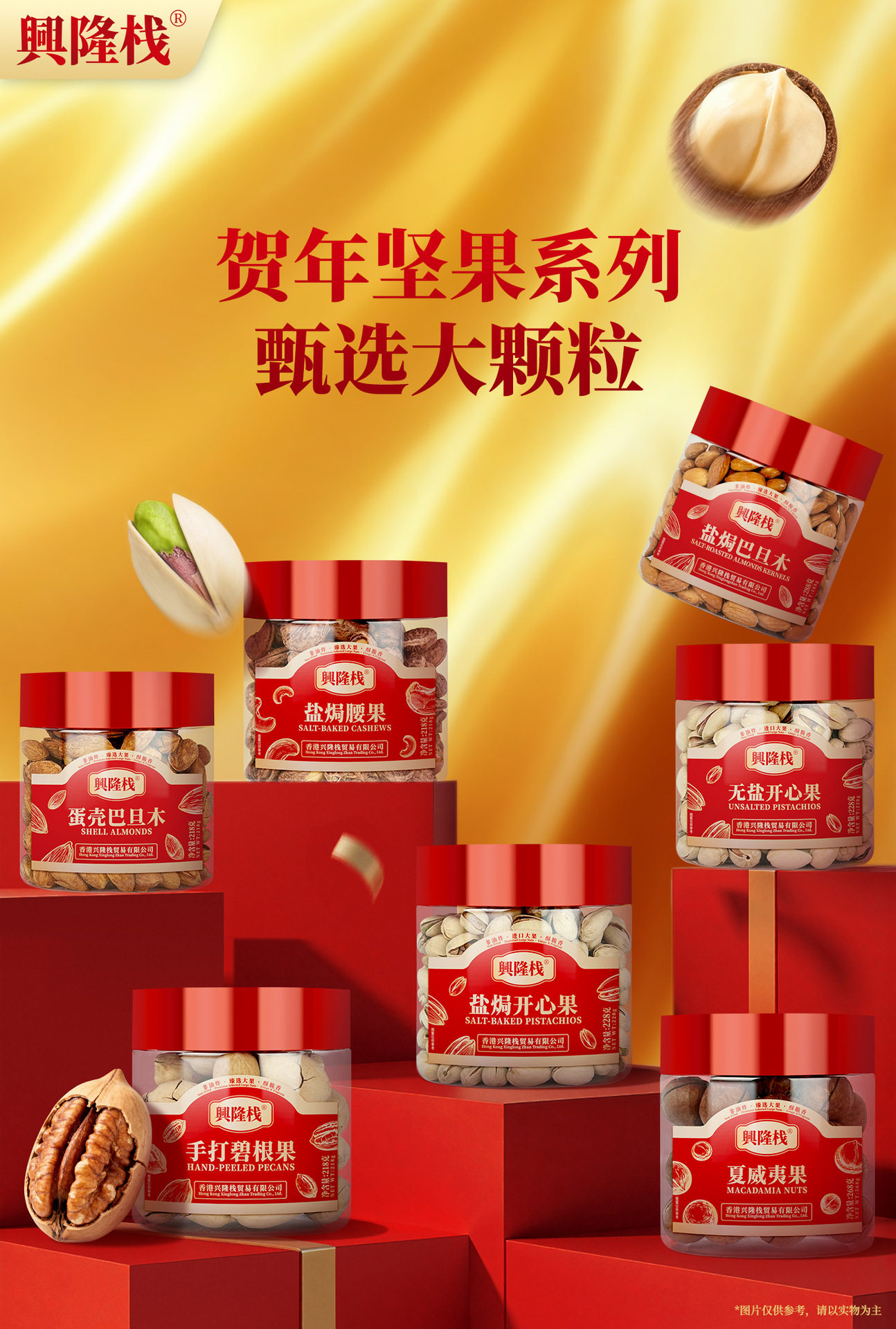 | Packaging specifications | Xinglongzhan eggshell almond wood 218g*1 can,Xinglongzhan salt baked almonds 288g*1 can,Xinglongzhan salt baked cashew nuts 218g*1 can,Xinglongzhan hand-made pecans 218g*1 can,Xinglongzhan salt baked pistachios 228g*1 can,Xinglongzhan salt-free pistachios 228g*1 can,Xinglongzhan macadamia nuts 268g*1 can |