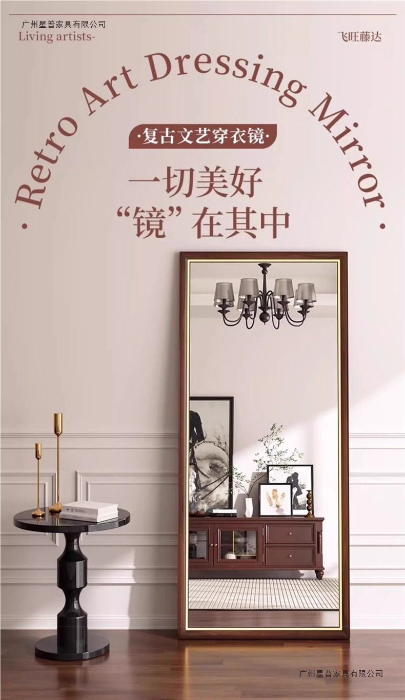 Large Mirror Solid Wood Full-Length Mirror Retro Dressing Mirror Floor Mirror Home High-End Internet Celebrity Girl Bedroom Fitting Mirror