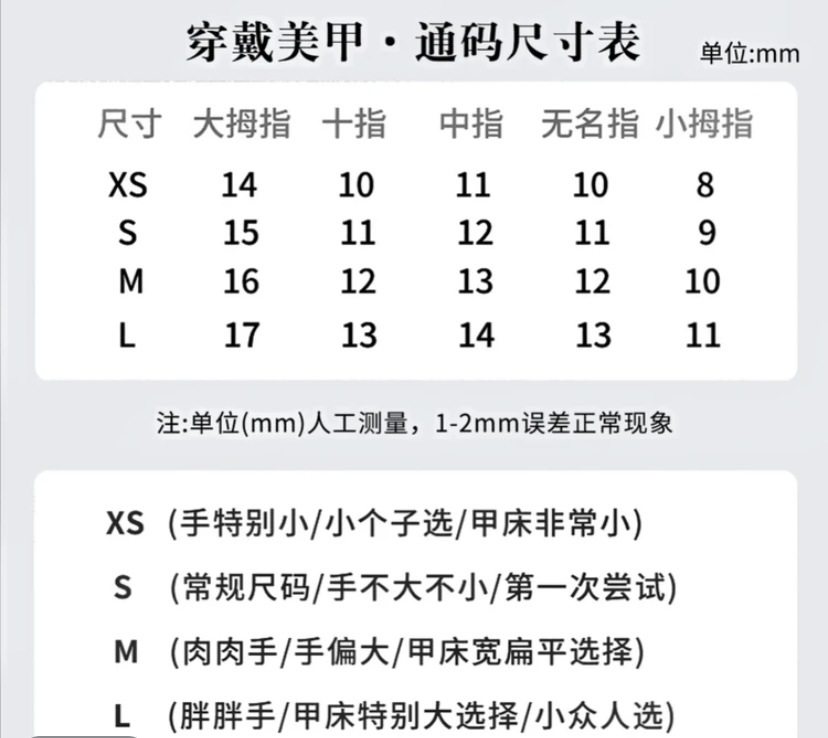 | Color classification | Xs code (for very small hands/small stature/small nail bed),S size (regular size/normal hand size),M size (fleshy hands/hands are too big/nail bed is too flat),L size (fat hands/extra large nail bed) |