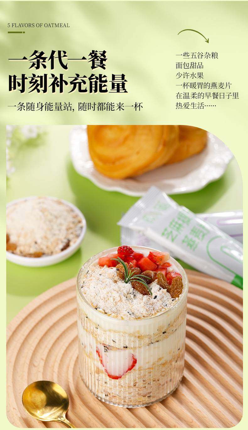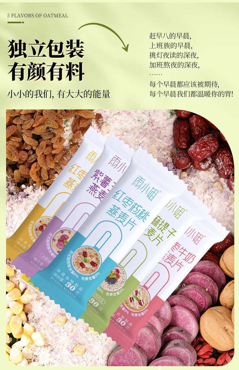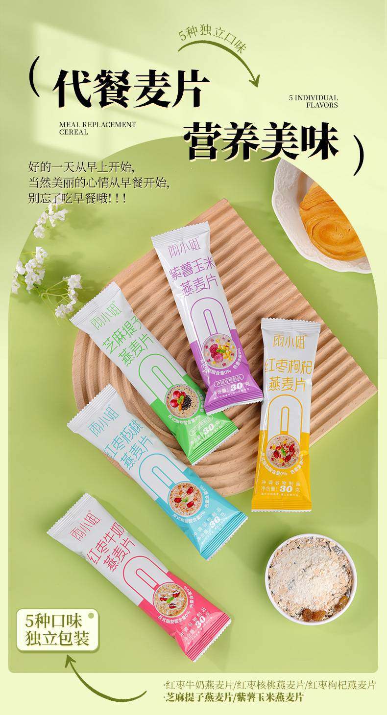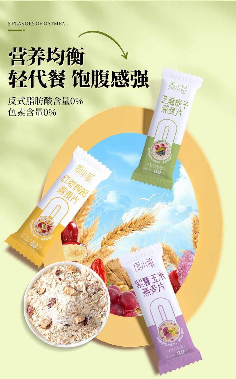 | Packaging specifications | 10 mixed flavors of meal replacement oatmeal 30g*10 bags,10 mixed flavors of meal replacement oatmeal 30g*20 bags,10 mixed flavors of meal replacement oatmeal 30g*30 bags,10 mixed flavors of meal replacement oatmeal 30g*50 bags,10 mixed flavors of meal replacement oatmeal 30g*80 bags |