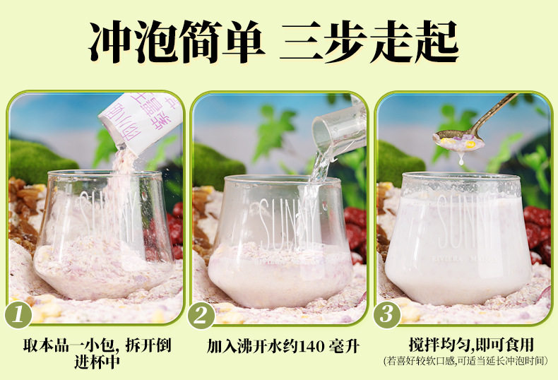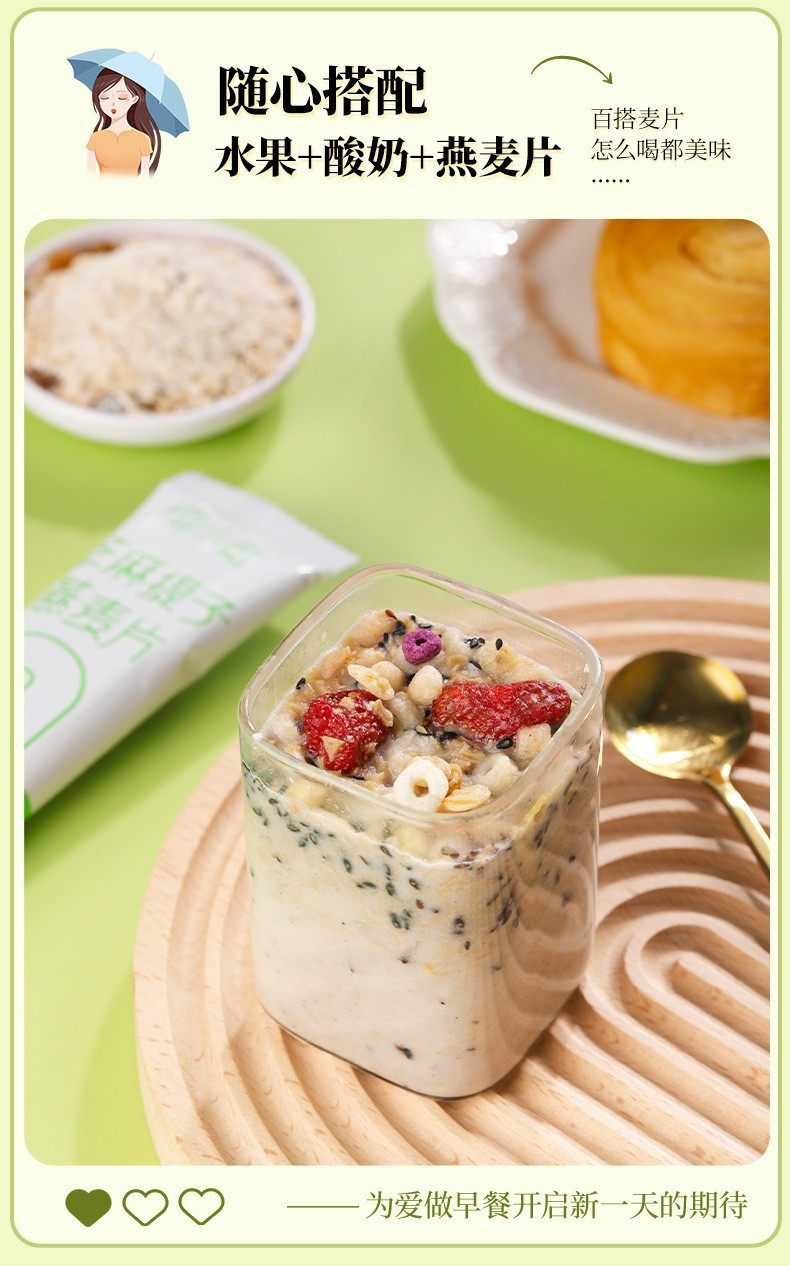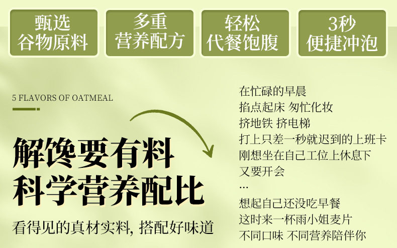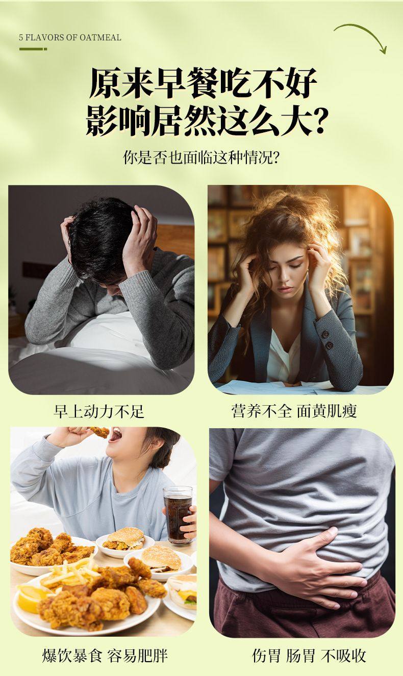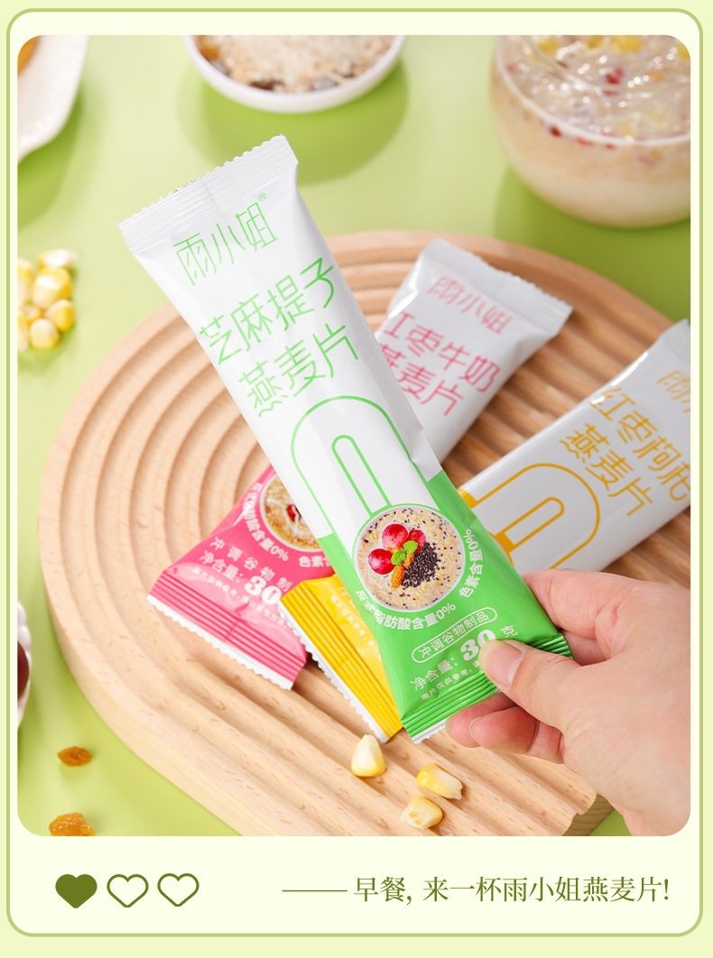 | Packaging specifications | 10 mixed flavors of meal replacement oatmeal 30g*10 bags,10 mixed flavors of meal replacement oatmeal 30g*20 bags,10 mixed flavors of meal replacement oatmeal 30g*30 bags,10 mixed flavors of meal replacement oatmeal 30g*50 bags,10 mixed flavors of meal replacement oatmeal 30g*80 bags |