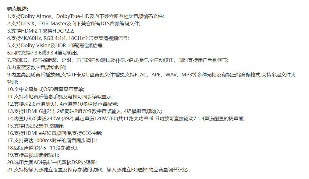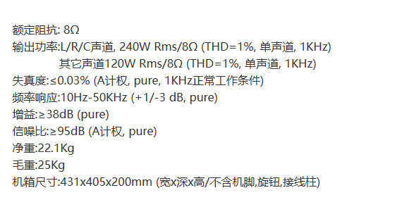 | Rated power | L/r/c channel, 240w rms/8ω (thd=1%, mono, 1khz) |