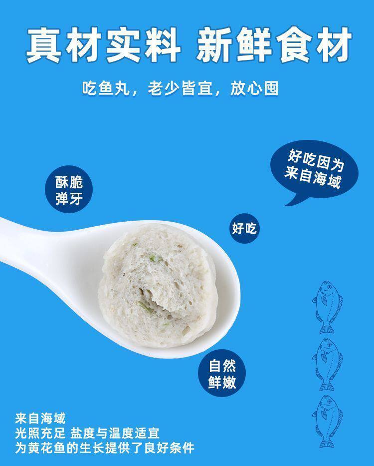 | Packaging specifications | Yellow croaker fish balls 200g*1 bag,Yellow croaker fish balls 200g*2 bags,Yellow croaker fish balls 200g*3 bags,Yellow croaker fish balls 200g*4 bags,Yellow croaker fish balls 200g*5 bags,Yellow croaker fish balls 200g*10 bags |